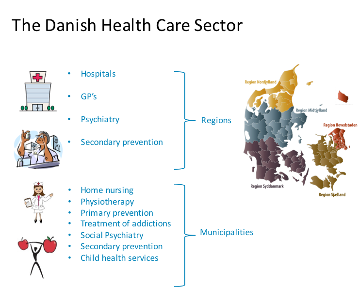 Figuur 1: Organisatie zorgstelsel van Denemarken. Gepresenteerd door Steen Rank Petersen, Head of Department of Health, Gemeente Gladsaxe, 1 september 2017