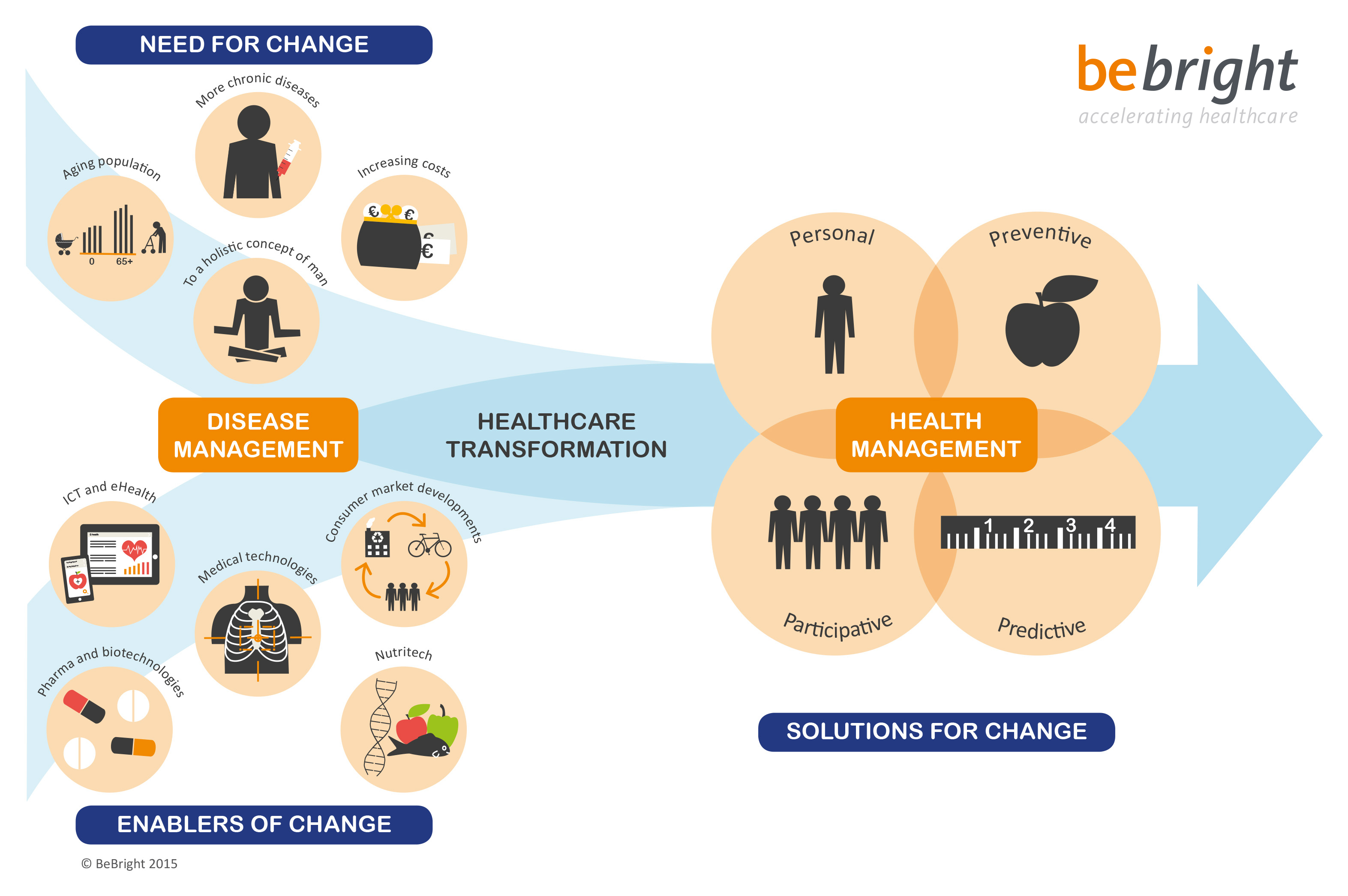 Aan de andere kant is er de ontwikkeling van nieuwe (technologische) mogelijkheden: de zogenaamde enablers for change. Zij creëren de mogelijkheid om in te spelen op de veranderingen binnen de vraagkant en kunnen bijdragen aan het vergroten van de doelmatigheid en kwaliteit van de zorg. De noodzaak tot verandering in zowel de vraagkant als het toenemend aantal technologische mogelijkheden vragen om innovatie en transformatie van de gezondheidszorg zoals we dat nu kennen. Als we kijken naar de toekomst van de Nederlandse gezondheidszorg zal deze door de nieuwe technologische mogelijkheden in de komende 15 tot 20 jaar steeds meer Persoonlijk, Preventief, Participatief en Predictief moeten en zullen worden.