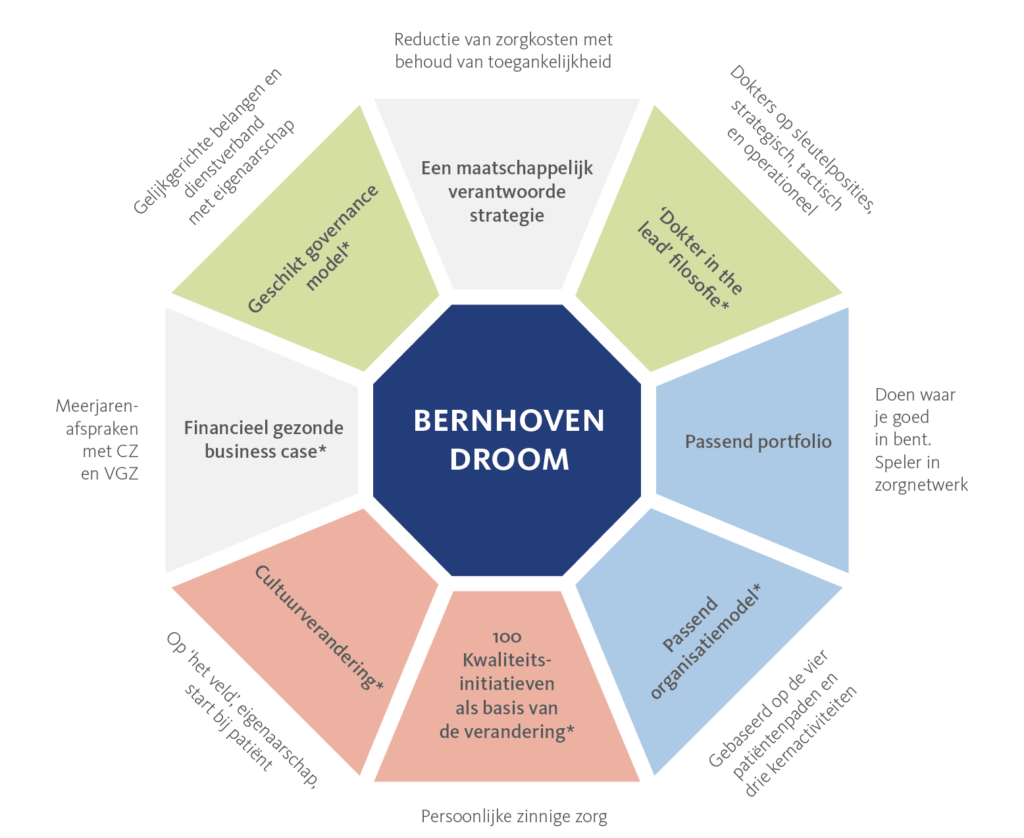 De transformatie van Bernhoven geeft inzicht in diverse randvoorwaarden voor succes. Een eerste grote stap vooruit was de samenwerking met zorgverzekeraars. Het principe zinnige zorg was de basis voor het maken van meerjarenafspraken met CZ en VGZ. Daarnaast begint een groep medisch specialisten en managers in 2014 met nadenken over de kwaliteit van de zorg. Hieruit ontstaan meer dan honderdkwaliteitsinitiatieven met de potentie tot betere zorg tegen lagere kosten. Deze initiatieven zijn de drijvende kracht achter de fundamentele verandering. Een andere cruciale voorwaarde voor succes was het ontwikkelen van een cultuur die transitie toelaat. Coöperatie en communicatie met elkaar vanuit dezelfde gezichtspunten stond centraal in een driedaags cultuurprogramma die alle medewerkers vanaf 2015 hebben gevolgd.