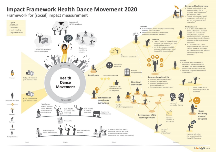 Om deze movement een kick-start te kunnen geven is er financiering en een solide business case nodig. In de afgelopen maanden is er door BeBright een impact framework ontwikkeld. In dit framework —dat als basis dient voor het meten van maatschappelijke impact — zijn alle benodigdheden (denk bijvoorbeeld aan geld, docenten en een netwerk) voor het programma en haar potentiële maatschappelijke waarde in kaart gebracht. Om deze waarde te achterhalen is een literatuuronderzoek uitgevoerd naar wetenschappelijke studies over vergelijkbare dans- en muziekprogramma’s. Deze studies laten zien dat de kwaliteit van leven en de fysieke en mentale gezondheid vooruit kan gaan door het deelnemen aan danssessies. Ook blijkt uit een eerste pilot van HDM dat deelnemers en hun partners dolenthousiast zijn over de impact die de lessen hebben op hun levens. Voor de opstart is startfinanciering benodigd maar met de verwachte effecten is HDM binnen enkele jaren een onderbouwd welzijnsprogrammma dat dan financieel op haar eigen benen kan staan.