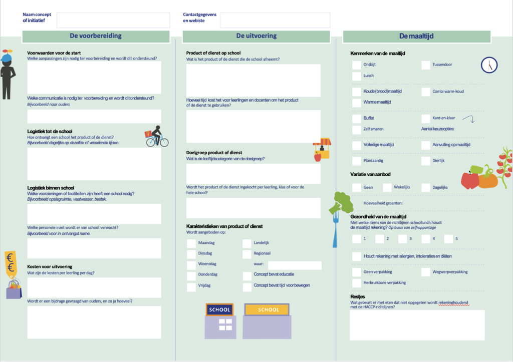 Steeds meer scholen bieden lunch aan, mede dankzij het nationale programma Schoolmaaltijden, en de belangstelling neemt toe. Maar scholen missen vaak overzicht van de mogelijke lunchconcepten, waardoor het maken van geïnformeerde keuzes over het kiezen van een lunchconcept lastig is. De conceptenkaart helpt scholen bij het kiezen van een passend concept. De kaart is tot stand gekomen in co-creatie met aanbieders en betrokkenen vanuit beleid en wetenschap. In de zomer van 2022 zijn de eerste stappen gezet, en de afgelopen maanden is de kaart uitgewerkt tot een product. Momenteel staan er 13 lunchinitiatieven op de kaart, gecategoriseerd op basis van verschillende indicatoren, zoals capaciteit, logistiek en financiën. Naast de overzichtskaart heeft elk initiatief een individuele conceptenkaart ingevuld, voorzien van specifieke informatie over het initiatief.