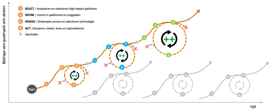 Klein beginnen met onderwerpen die veel impact hebben en veel kosten besparen. En daarna snel handelen: na de vier stappen vindt een verbreding plaats naar andere patiëntgroepen. Zo wordt langzaam opgeschaald tot optimale waarde wordt toegevoegd voor elke patiënt, op het juiste moment en op een plek die past.