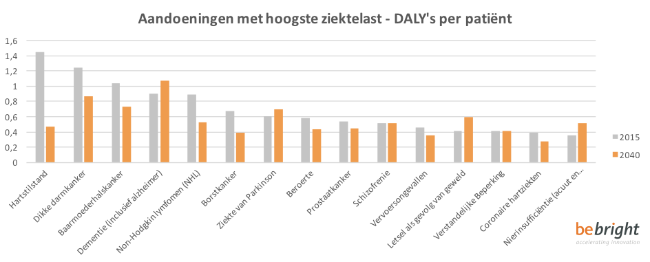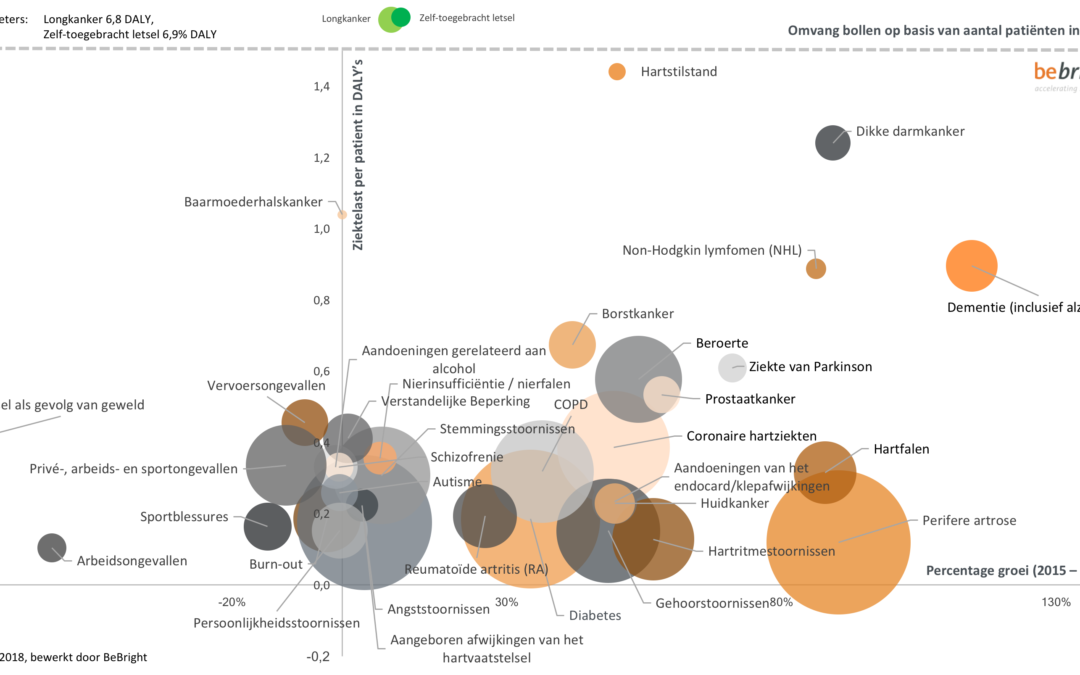 In het overzicht zijn de meest voorkomende aandoeningen geplot op basis van omvang, groei en ziektelast. De horizontale as geeft de procentuele groei van het aantal patiënten tussen 2015 en 2040 weer. De ziektelast per patiënt in DALY’s (Disability-Adjusted Life Year, een index waarbij mortaliteit en morbiditeit worden gecombineerd[1]) op de verticale as. Het aantal patiënten in 2015 is weergegeven in de omvang van de bollen.