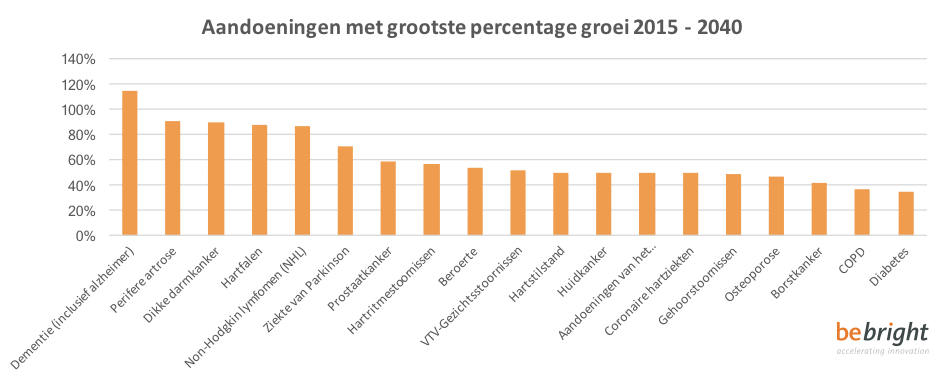 Kijkend naar aandoeningen groot in omvang, groei richting 2040 en hoogte van de ziektelast, springen er vijf uit: